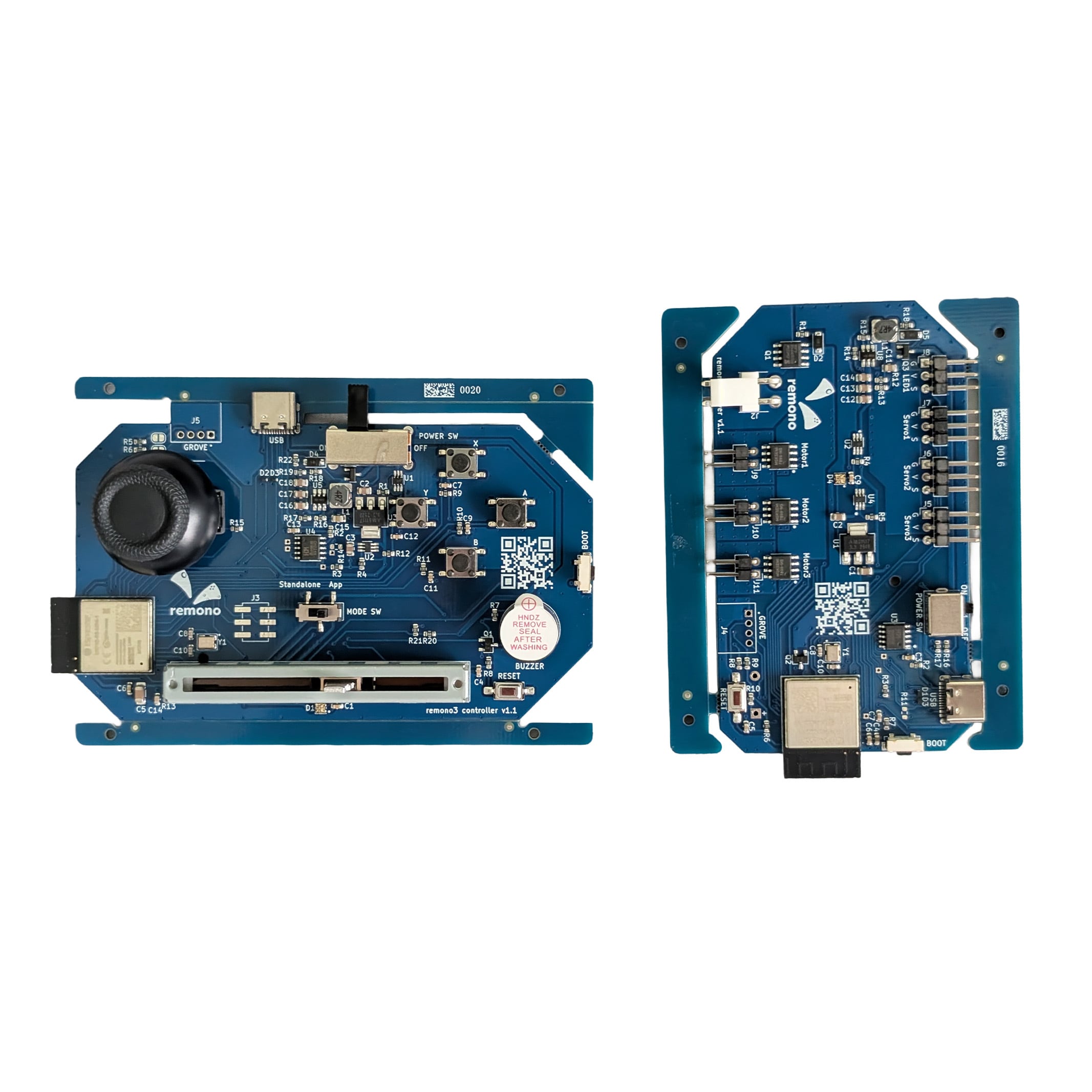 DCモーターやサーボモーター、LEDを操作するためのドライバー「remono3 driver」と、remono3 driverに接続したデバイスを遠隔操作するためのコントローラー「remono3 controller」の基板セットです。