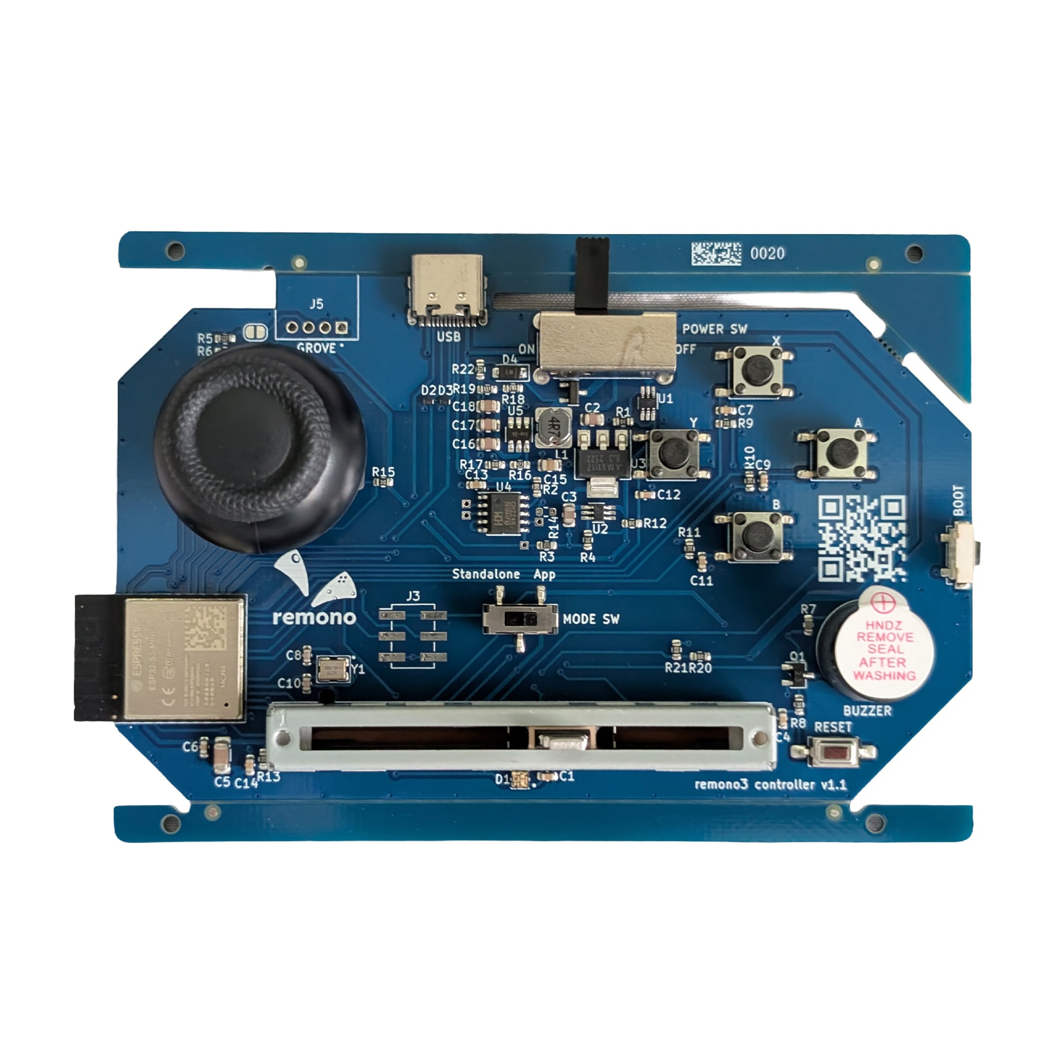 remono3 driverに接続したデバイスを遠隔操作するためのコントローラーの基板です。 ご購入者の方には筐体の3DモデルとラベルデータのダウンロードURLを送付いたします。 ※電池は別売りです